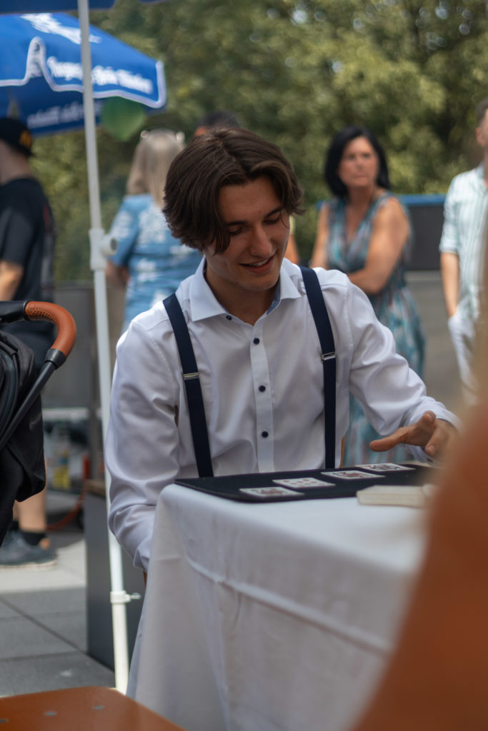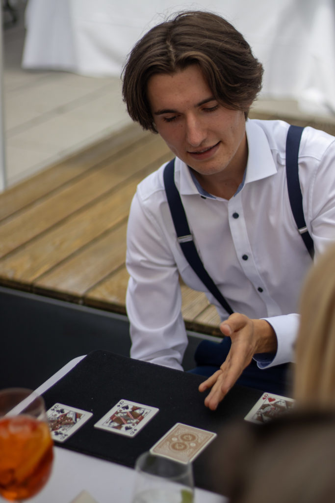 Meine Tischzauberei biete ich in Form von Tablehopping an, dass heißt ich führe eine 5-15min Close Up Show an einem Tisch vor und ziehe dann weiter zum nächsten Tisch. So kann jeder Gast seine individuelle Erfahrung genießen. Falls Ihr Interesse geweckt ist, kontaktieren Sie mich noch heute.